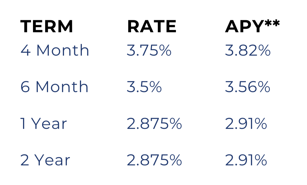 Have some cash on hand that you want to put away for use in the future? For as little as just $1,000 (minimum opening balance), you can earn more interest in the process with a Certificate of Deposit*!